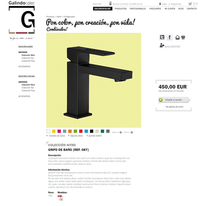 Diseño y programación de e-shop y un completísimo configurador de grifos. La tienda online realizada tiene como característica diferencial que ofrece la capacidad de pintarte el grifo escogido con la combinación de colores que se desee, en total más de 5400 combinaciones. Un difícil trabajo tanto de usabilidad como de fotografía, pero el resultado fue realmente espectacular. En todas las pruebas que se hicieron, el rendimiento de nuestro configurador era mucho mejor que el de Nike o Munich.